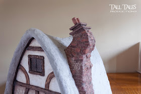 So here are some photos I took along the way last year. The roof was finished with Celluclay (I'll upload a video demo of that to Vimeo soon), I painted and textured the thatch, put in lattice windows and added moss and aging on the thatch and up the walls.